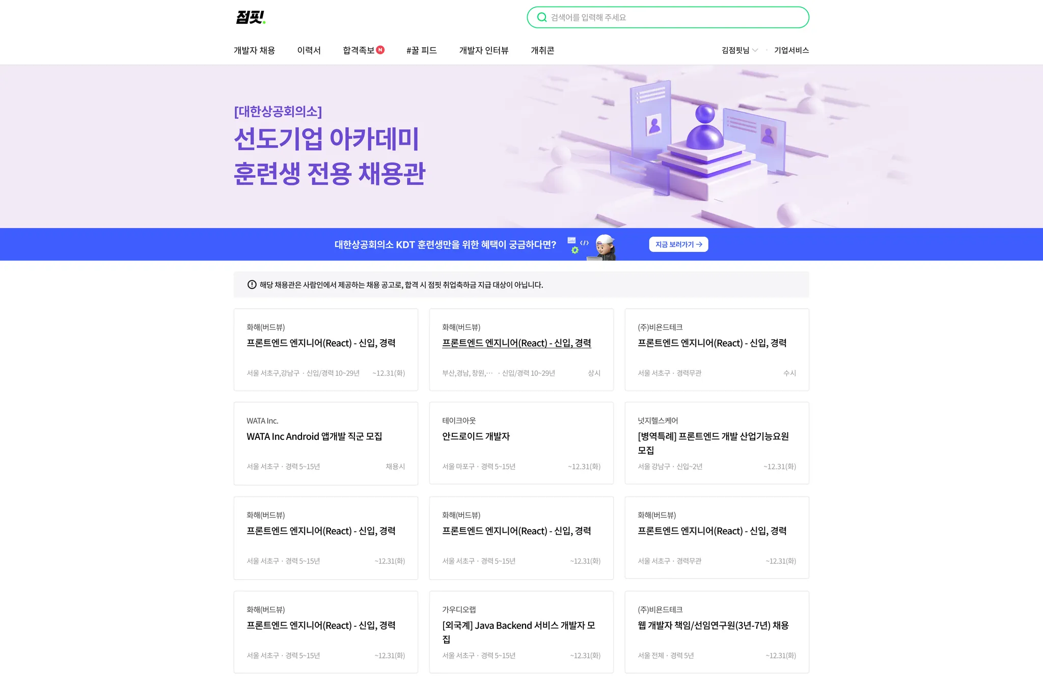 훈련생 전용 채용관은 대한상공회의소 KDT 훈련 과정 인증 완료한 회원만을 위해 준비한 채용관이에요.