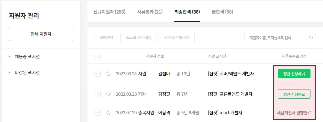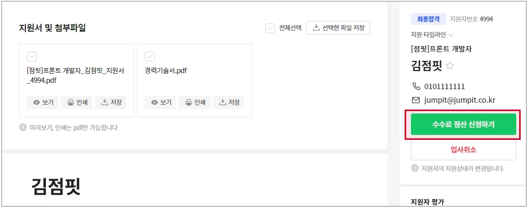 지원자 관리 리스트와 해당 지원자 상세 뷰에서 정산 신청 및 정산 상태 확인이 가능합니다.