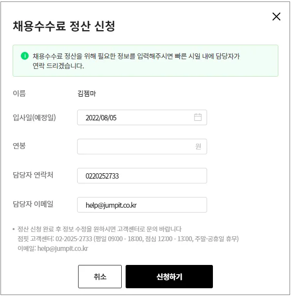채용 수수료 정산 신청 팝업에서 정보 입력 후 [신청하기] 버튼을 클릭하여 신청을 완료해주세요.