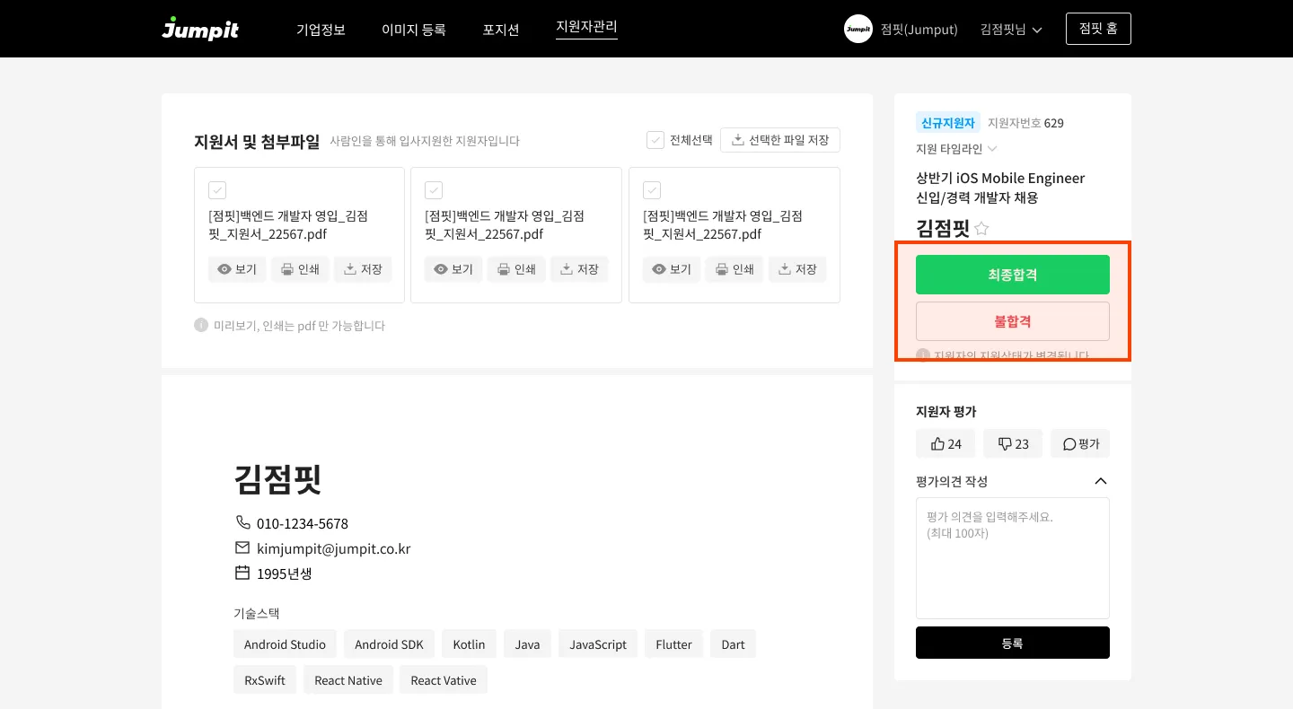 지원자 관리 리스트와 해당 지원자 상세 뷰에서 지원자 상태 변경이 가능합니다.