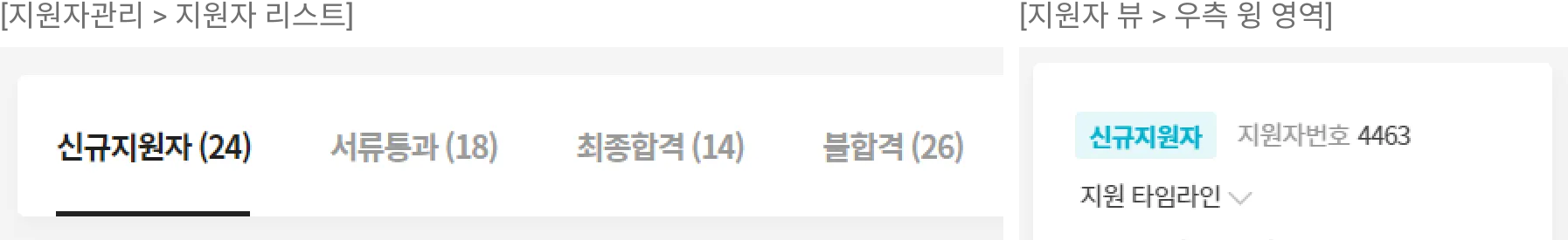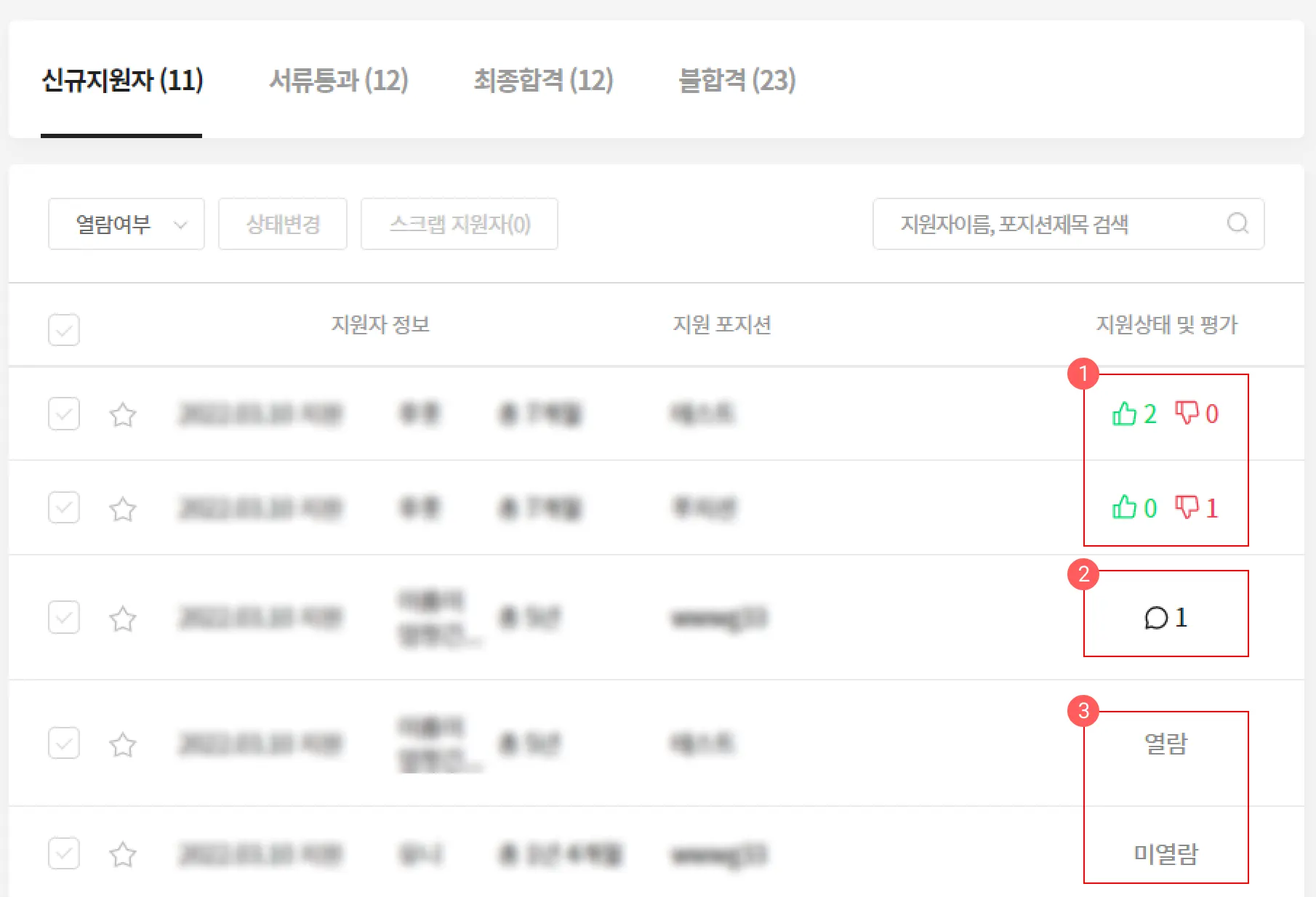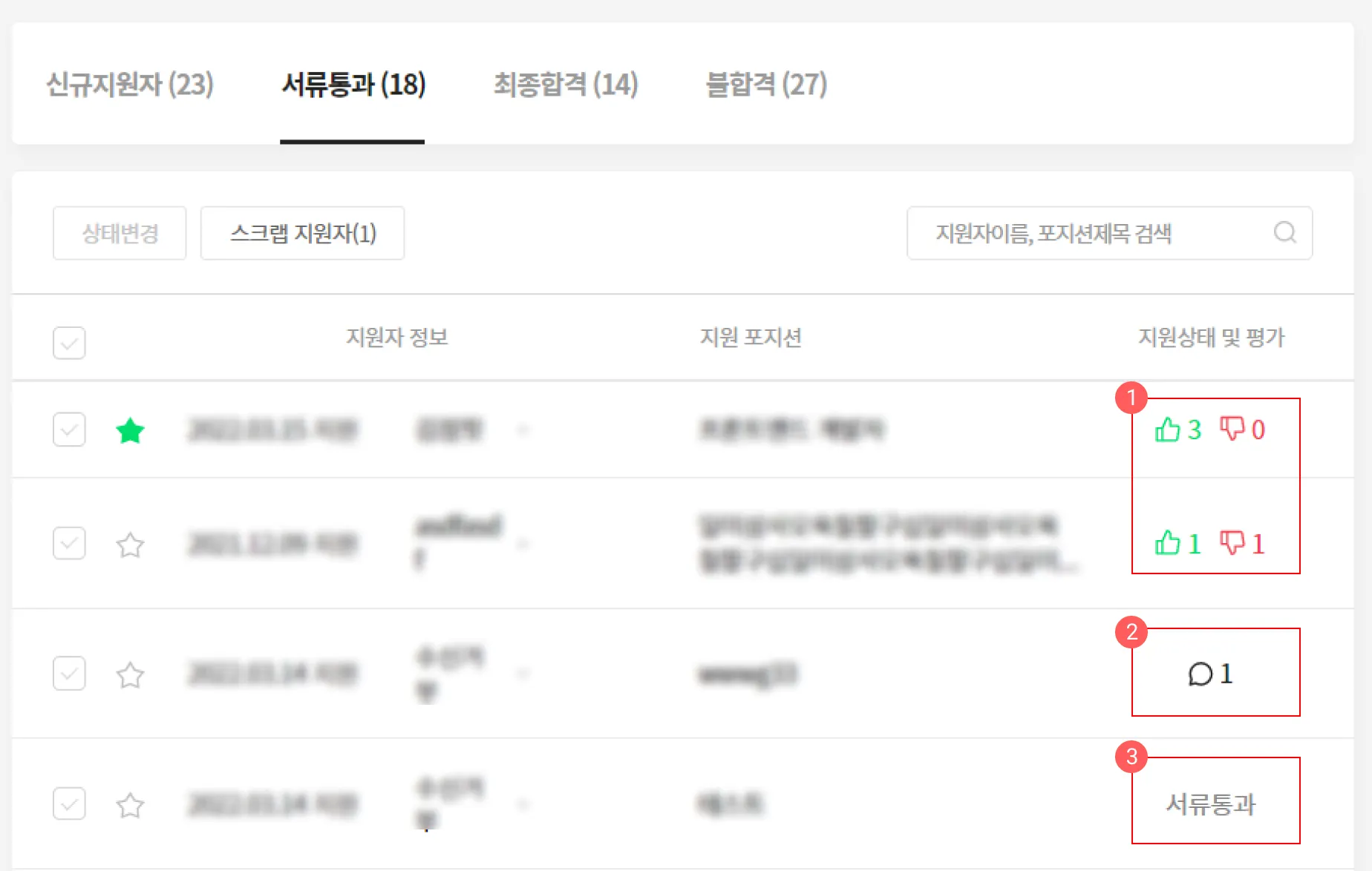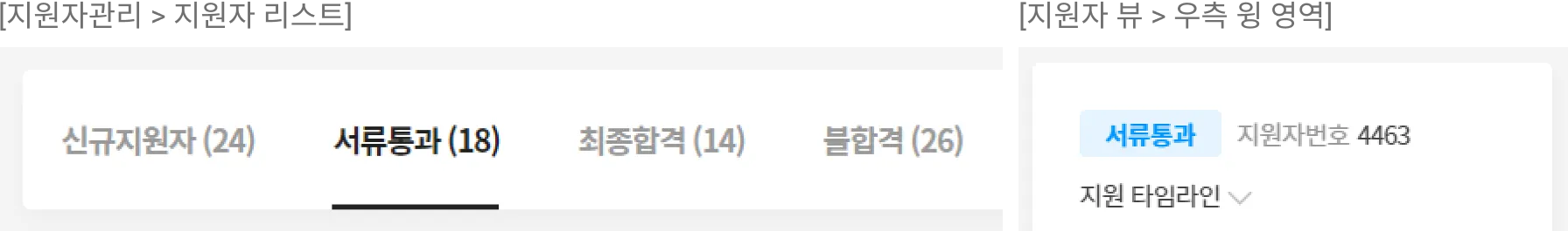 서류 통과 전 지원자(신규지원자)에 대한 평가는 ‘서류평가’에 기록됩니다.