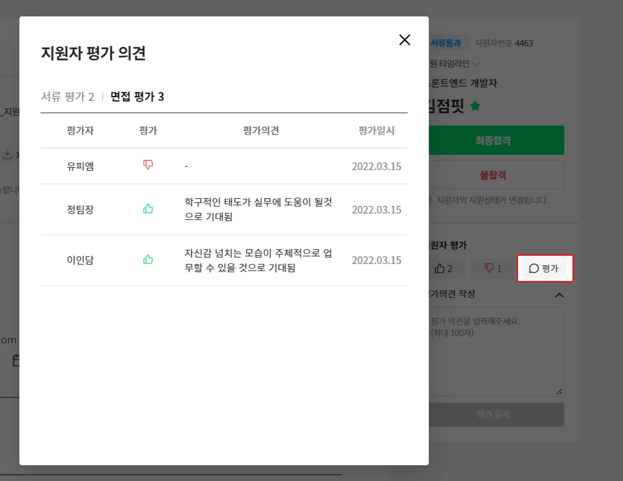지원자에 대한 평가가 있는 경우, [평가]버튼을 클릭하여 평가 이력을 확인할 수 있습니다.