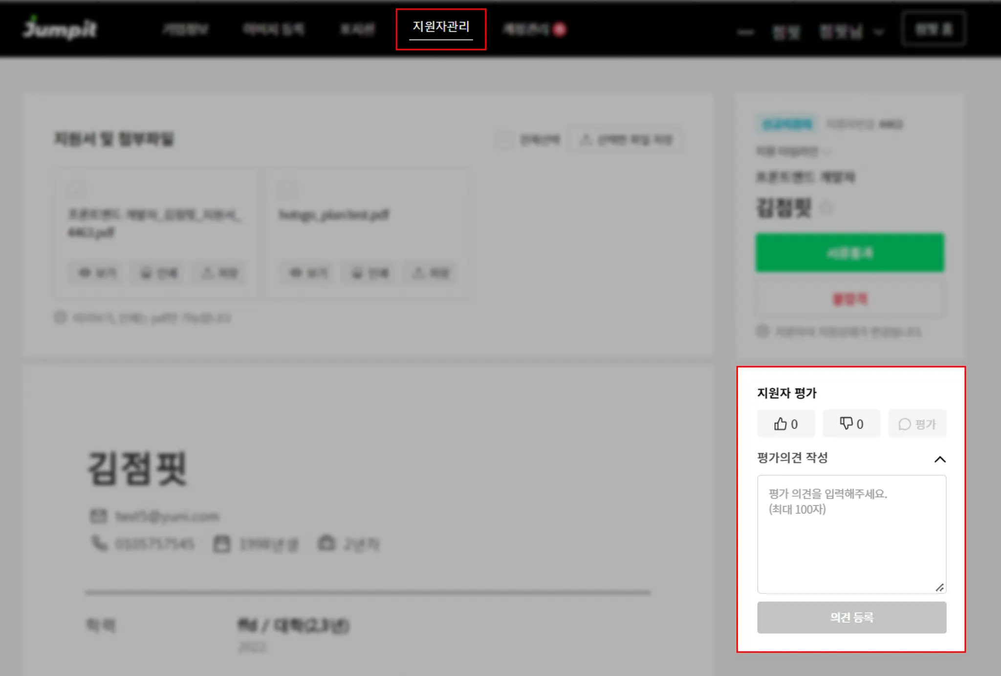 우측 윙 영역에서 지원자에 대한 평가 의견을 남길 수 있습니다.