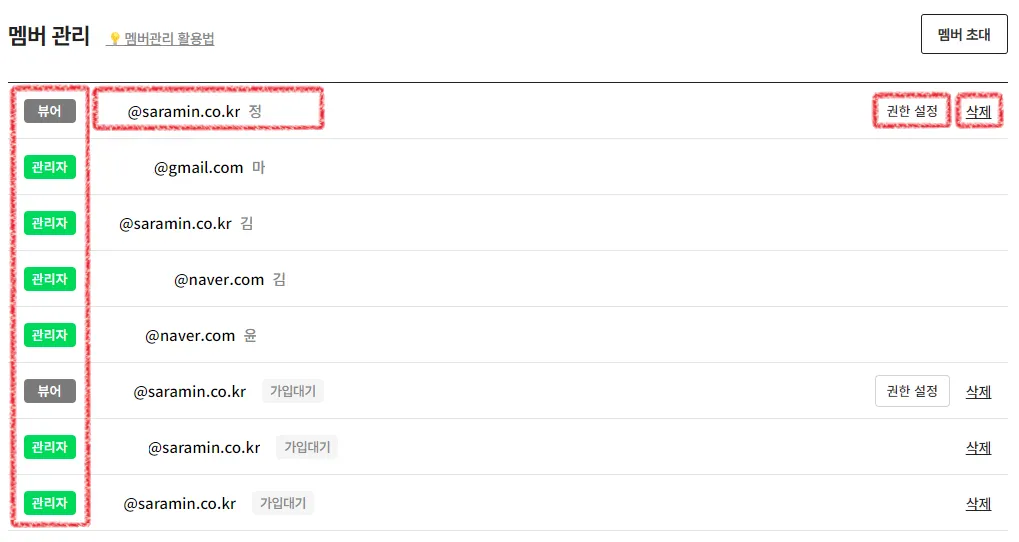 초대된 계정의 이메일 주소가 표시되고, 가입이 완료된 회원일 경우 이름까지 표시됩니다.