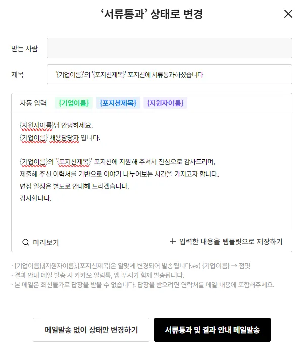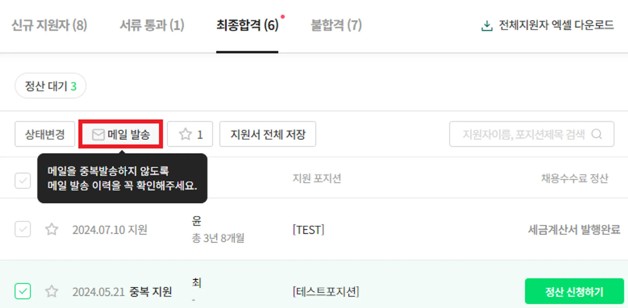 신규 지원자가 아닌 상태(서류통과, 최종합격)에서는 자유롭게 메일 발송이 가능합니다.