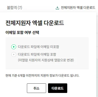 전체 지원자 엑셀 다운로드를 할 수 있습니다.