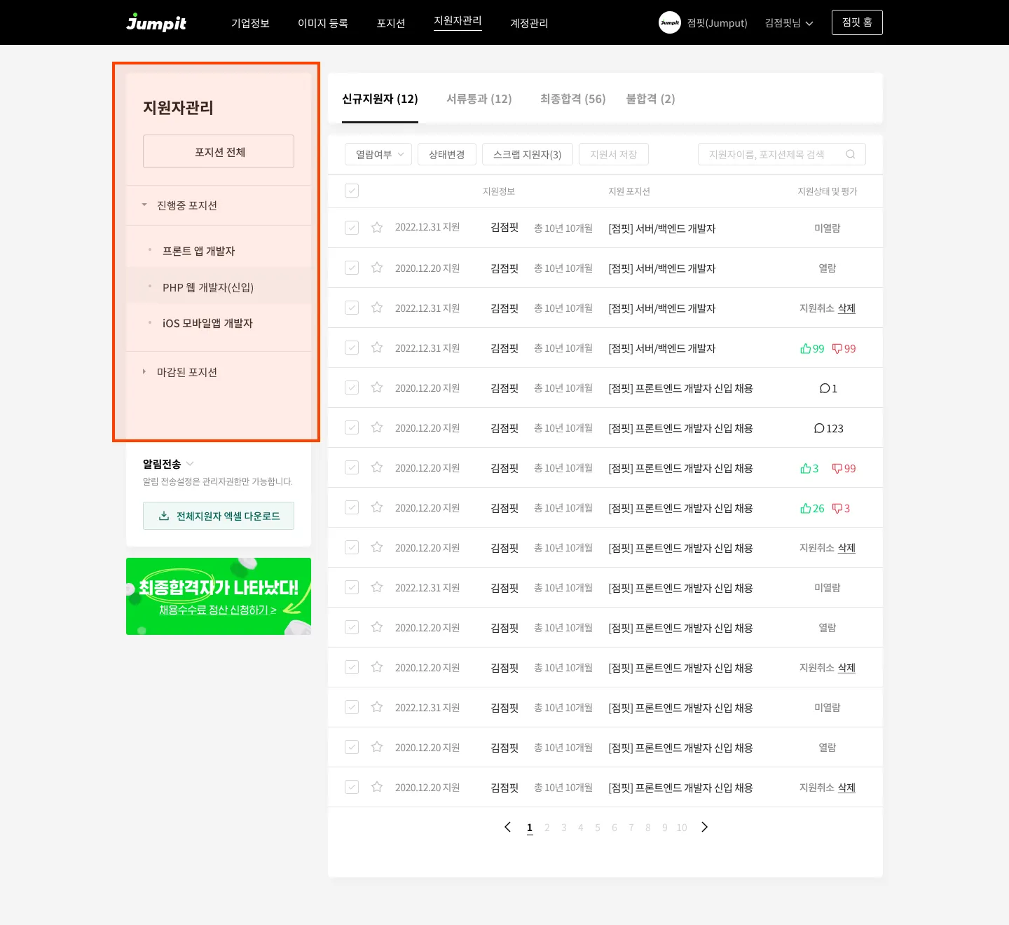 진행중 포지션 : 진행중인 포지션 별로 지원자를 확인할 수 있습니다.