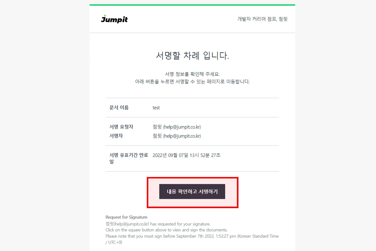 계약 담당자 이메일로 발송된 서명 요청 메일 [내용 확인하고 서명하기] 버튼 클릭