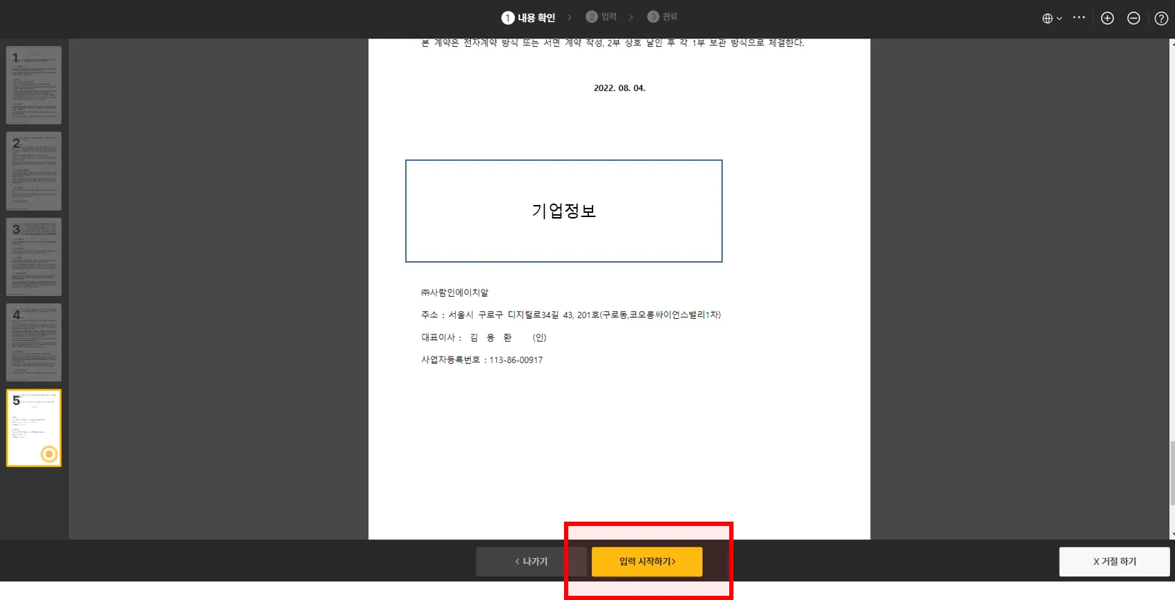 계약서 내용 확인 후 [입력 시작하기] 버튼 클릭