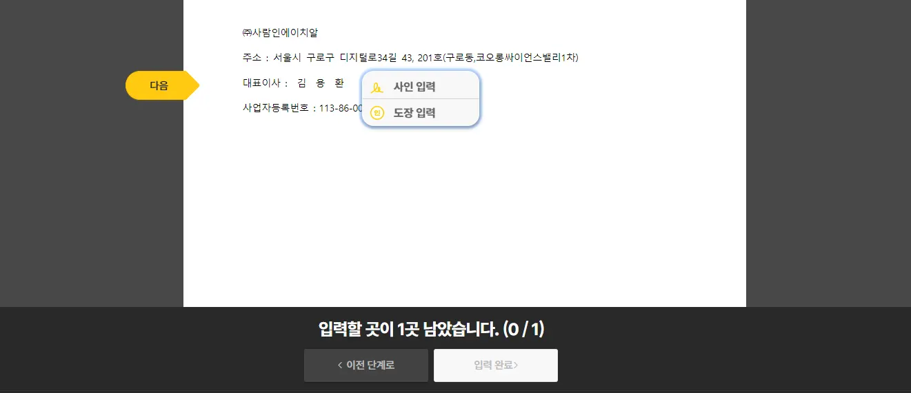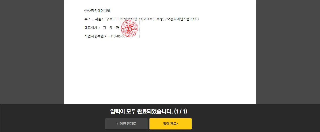 도장 또는 사인 입력 후 [입력 완료] 버튼 클릭